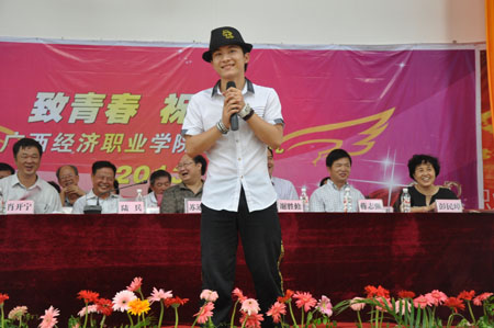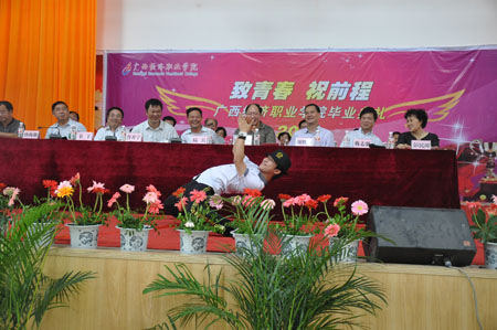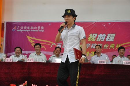 典礼上还穿插了众人期待已久的著名达人秀总冠军、学院形象代言人卓君的精彩表演,他和场上的同学、老师们共同分享了职业生涯的经历与感想,激励同学们“要学会坚强,勇敢的面对社会的挑战,做生活的强者!”他的舞姿和每一个动作,更是同学们掌上手机中的焦点,使毕业典礼达到了高潮!