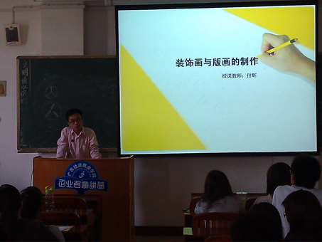 为参加广西壮族自治区教育厅举办的2011年《广西第三届大学艺术展演活动》比赛,我系动员全系学生积极参赛,为此次比赛能够获得好成绩,5月6日下午在B栋多媒体教室,我们聘请到了兄弟院校付辉老师到我系进行讲座,在会上付辉老师通过图片对各种绘画进行深入的讲解,有同学们熟悉的水粉、水彩、油画、版画等传统绘画,还展示了工艺装饰画,如纸巾画、铜丝画、毛线画等,并且现场还进行了版画技巧的演示,通过学习同学们受益匪浅,对自己的参赛作品有了更进一步的想法,对比赛充满信心。