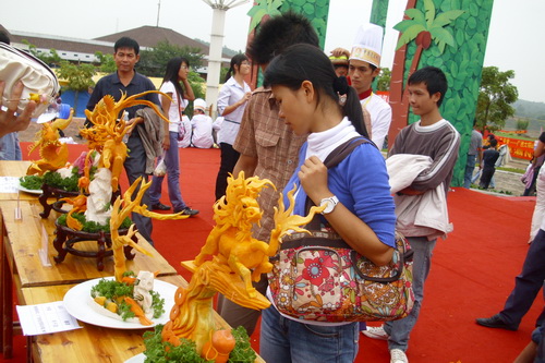 2009年10月17日,一年一度的南宁-东南亚国际旅游美食节在南宁市青秀山东南亚美食城开幕了。自美食节开幕以来,吸引了大批市民前往参观品偿,这样的机会我们当然不能错过。10月22日,我系组织2009级烹饪工艺与营养专业的学生前往参观学习,其中位于美食城中央舞台上进行的食品雕刻比赛让同学们驻足,久久不愿离去,看着行家选手们精湛的食雕技艺,同学们都暗自下定决心,大学三年里一定要把本领学好,来年也要参加这样的比赛。