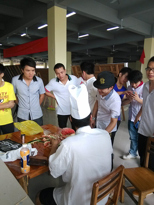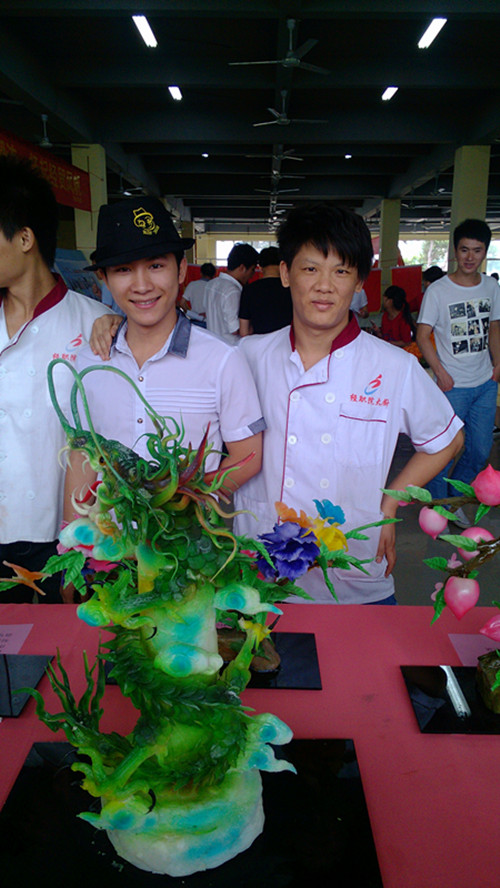 2013年6月27日,2013届学生毕业典礼上,我系在综合楼二楼举办了学生作品展。这次作品展,学生提前了一个星期做好了充足的准备,精心制作了十几个糖艺作品,让所有到场的领导、老师、学生耳目一新,赞叹不已。吸引了包括广西自治区原主席、名誉院长陆兵,达人秀总冠军卓君等领导、娱乐明星的眼光。另外用南瓜、胡萝卜等材料制作了一个长达1米的孔雀,也吸引了不观众的眼光,纷纷掏出手机拍照合影。