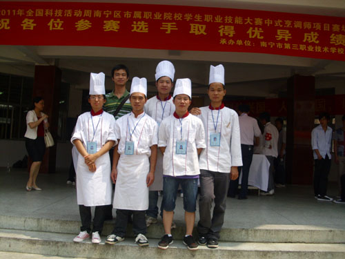 由我系专职教师罗家斌老师为领队的,以09级烹饪工艺与营养专业班的玉利、阮燕文、陆双有、韦满益、杨植添等同学组成的代表队,于2011年5月25号参加了在南宁市三职校举办的2011年南宁区市属高等职业院校、中等职业学校、民办职业培训学校学生职业技能大赛。