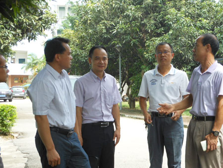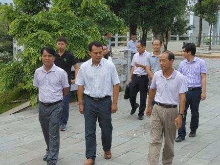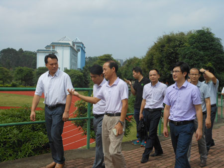 督导组在学院大门下车后,在景观台前,观看了学院的教学楼、运动场等外景,督导组组长潘耿华认真听取学院张院长的简要介绍,时不时提问。督导组的其它成员也与陆处长、宁主任了解详情。督导组就这样边走边看边聊,调研掌握学院基本情况和党建工作的成绩和面临的困惑。最后,督导组参观了学院综合楼的实训模拟课堂,对学院模拟企业的教学模式大为赞赏。